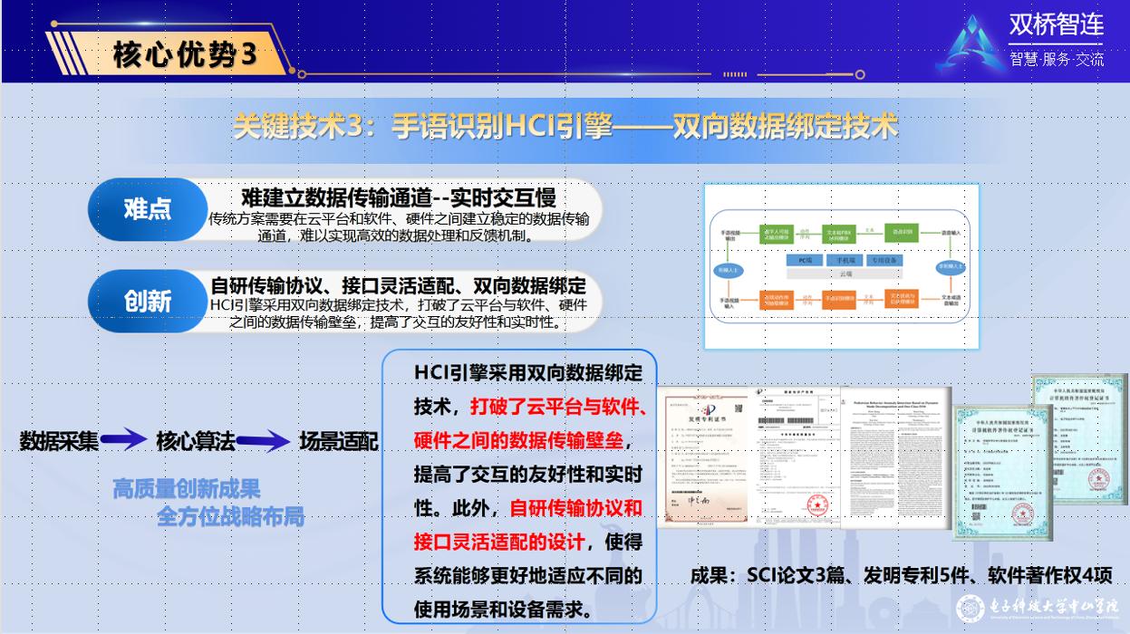 sunbet申搏双桥智连团队依据《国家通用手语词典》的标准内容,并结合特殊教育学校的应用实践,开发了基于HCI的智能手语识别系统。团队以深度学习手语识别技术为核心,结合双向数据绑定和AI数字技术,成功构建了手语识别智能模型,搭建了基于HCI的多平台智能手语识别系统,解决了自然手语的语法与语义分析、样本自动标注和模型的无监督训练等技术难题。目前系统已实现了多元手语动作的识别语音和3D动画的翻译转化,从多维度为听障人群提供双向翻译交流功能,实现听障人士与正常人之间的无障碍准确交流。