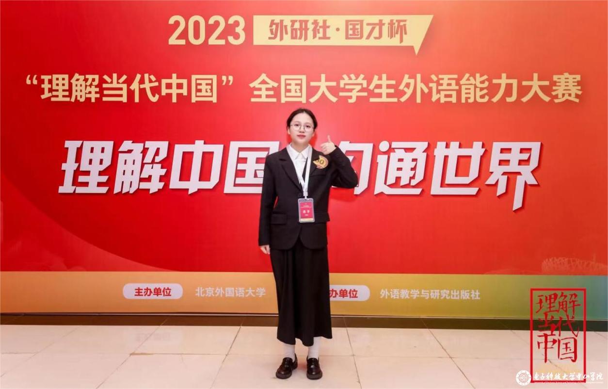 本届“外研社•国才杯”“理解当代中国”全国大学生外语能力大赛分为校赛、省赛、国赛第一轮、国赛第二轮(决赛)四个阶段,通过笔译、口译、命题演讲、即兴演讲以及评委现场提问等方式,全方位考察参赛选手的外语综合能力。宋晓妮在省赛胜出后作为广东参加国赛的四位选手之一成功通过国赛第一轮的角逐,最终在决赛中取得优异成绩。